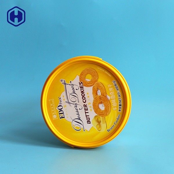 ক্রিম বিস্কুট আইএমএল বালতি কাস্টমাইজ করুন হলুদ প্লাস্টিকের ধারক রাউন্ড খালি প্যাকেজিং
