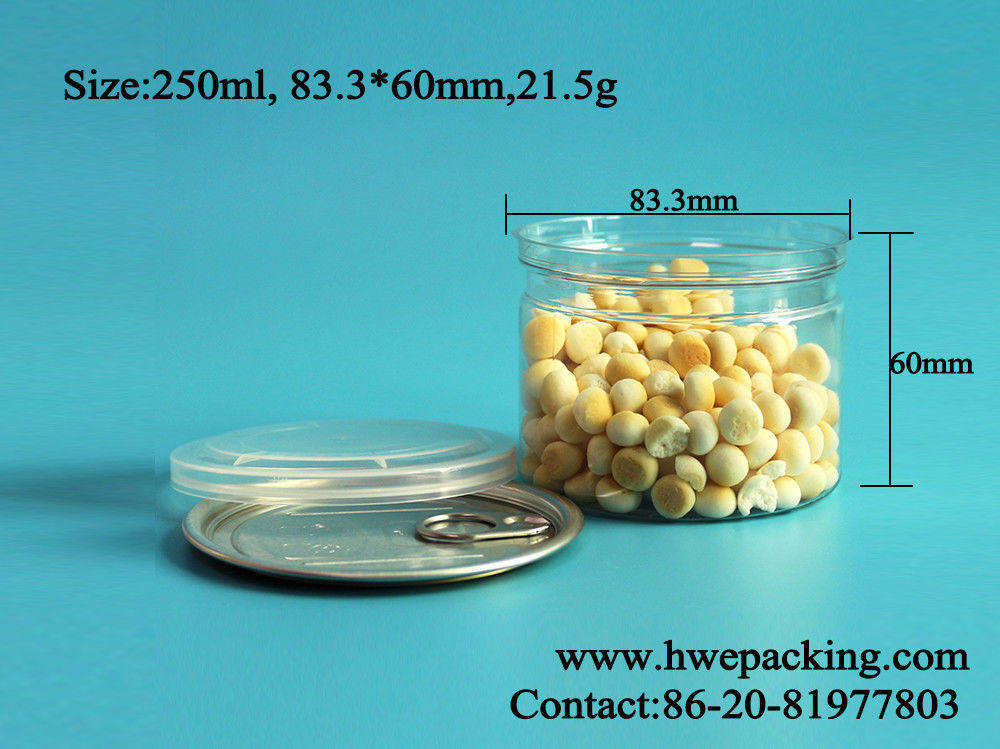এটি হল #307 প্লাস্টিকের পিইটি ক্যান যা আপনি ক্যানে স্ন্যাক ফুড পণ্যগুলি পূরণ করার পরে, অ্যালুমিনিয়াম EOE ঢাকনা (ইজি ওপেন এন্ডস ঢাকনা) ঢাকনাটি সিল করার জন্য সিলিং মেশিনের প্রয়োজন, আমরা প্রয়োজনে ক্লায়েন্টদের জন্য ম্যাচ সিলিং মেশিনও সরবরাহ করি।আমরা সেই প্লাস্টিকের টান ট্যাব ক্যান অফার করি যা রাখতে পারেক্যানে 250 মিলি জলের ধারণক্ষমতার পণ্য, এবং এই টান ট্যাব ক্যান লিক প্রুফ এবং 100% বায়ুরোধী।