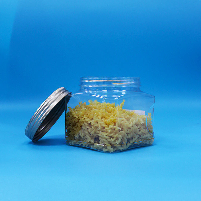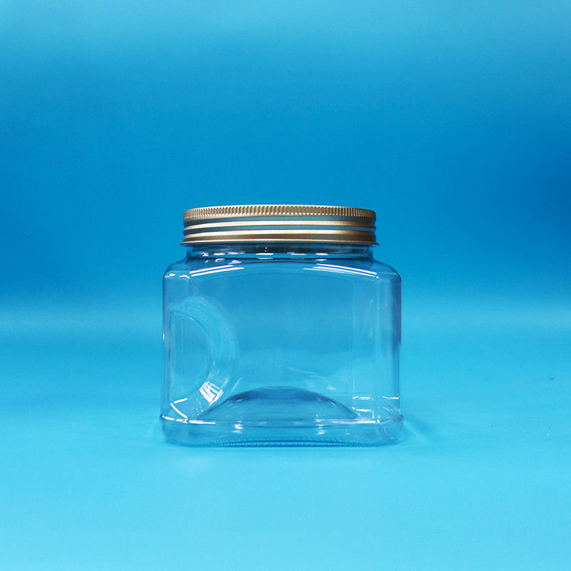 খাদ্য গ্রেড মিষ্টি খাদ্য স্ন্যাক পিইটি স্বচ্ছ বর্গাকার প্লাস্টিকের গ্রিপ জার অ্যালুমিনিয়াম ঢাকনা