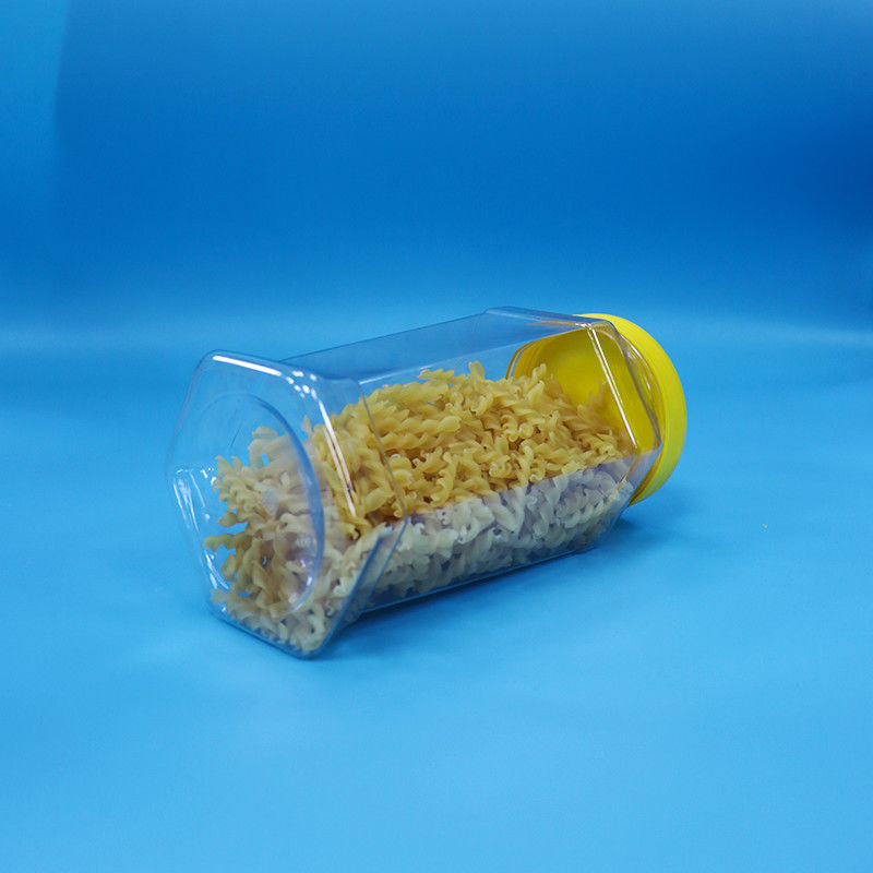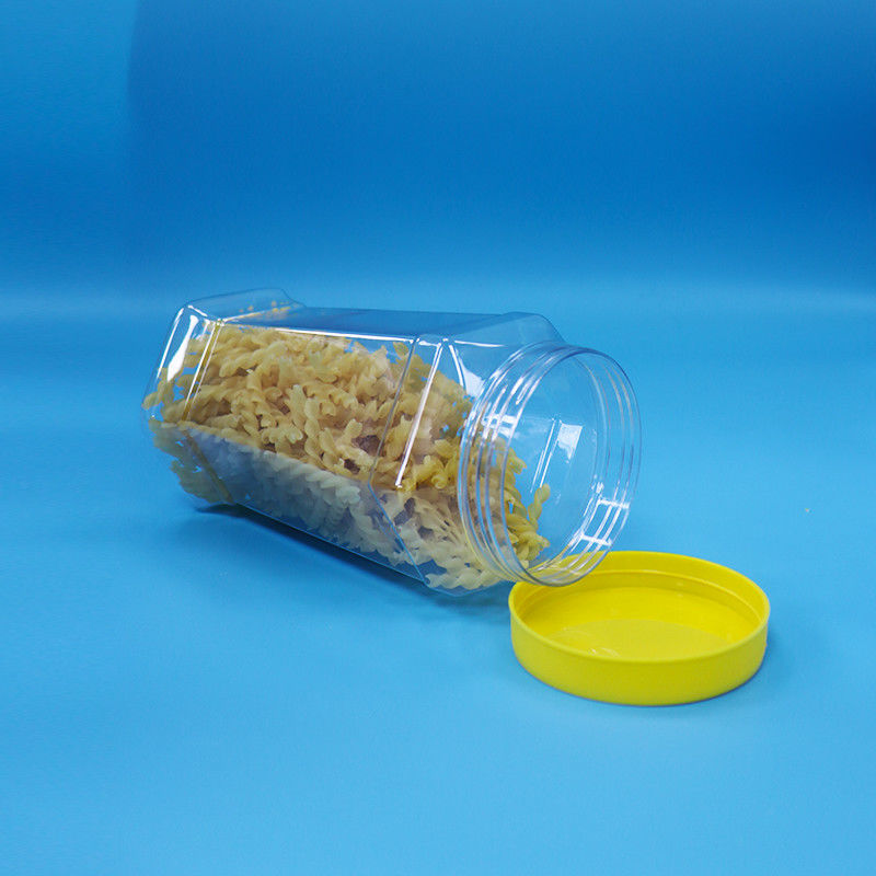 হেক্সাগোনাল আকৃতির ফুড গ্রেড কুকি মিষ্টি ফুড ক্লিয়ার পিইটি জার হলুদ ফ্ল্যাট ক্যাপ