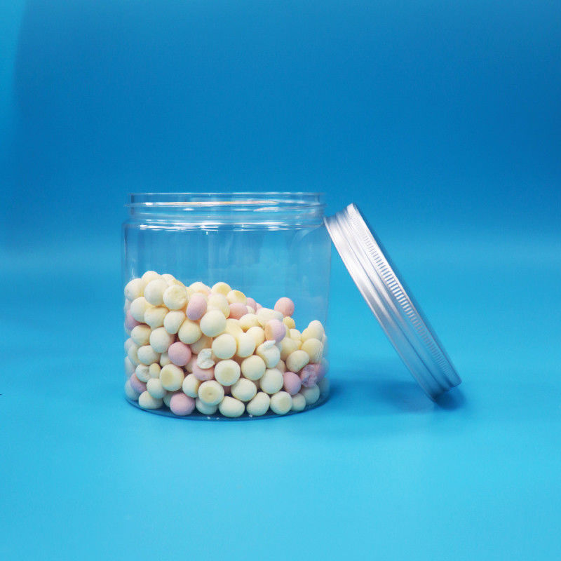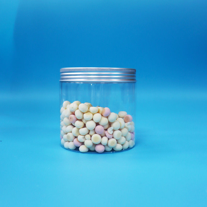 বৃত্তাকার প্রশস্ত মুখ সিলিন্ডার আকৃতি পরিষ্কার পিইটি প্লাস্টিকের কুকিজ জার অ্যালুমিনিয়াম স্ক্রু ক্যাপ