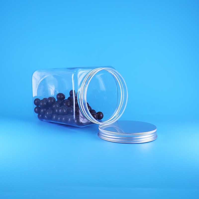 স্বচ্ছ সস্তা খালি বর্গক্ষেত্র PET প্লাস্টিক ক্যান্ডি লম্বা জার বাল্ক ফ্ল্যাট অ্যালুমিনিয়াম ক্যাপ