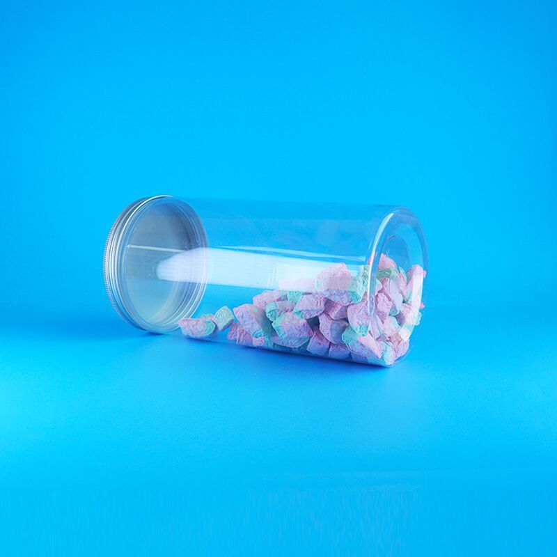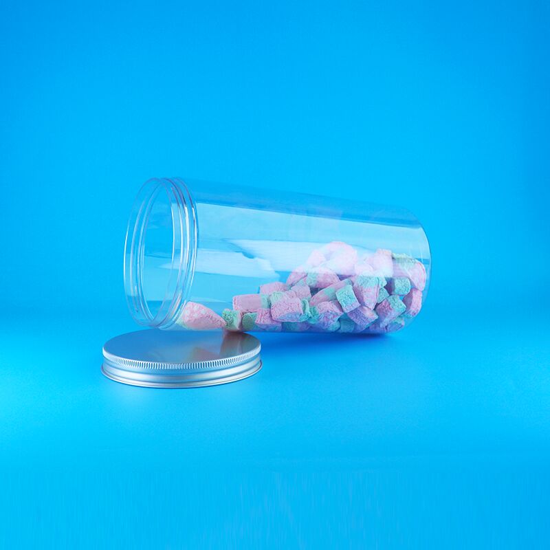 প্রশস্ত মুখ অ্যালুমিনিয়াম কভার স্বচ্ছ উচ্চ বৃত্তাকার প্লাস্টিক শুকনো খাদ্য কুকিজ মিষ্টি জার